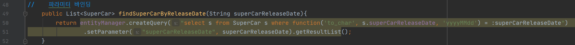 SQL문 뒤에는 결과 중 한 개 행에 대한 resultType을 작성해준다. 여러개 행을 가져올 때에는 getResultList()를 사용한다.