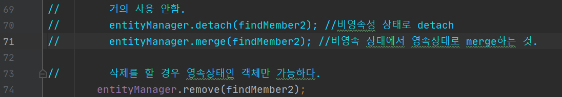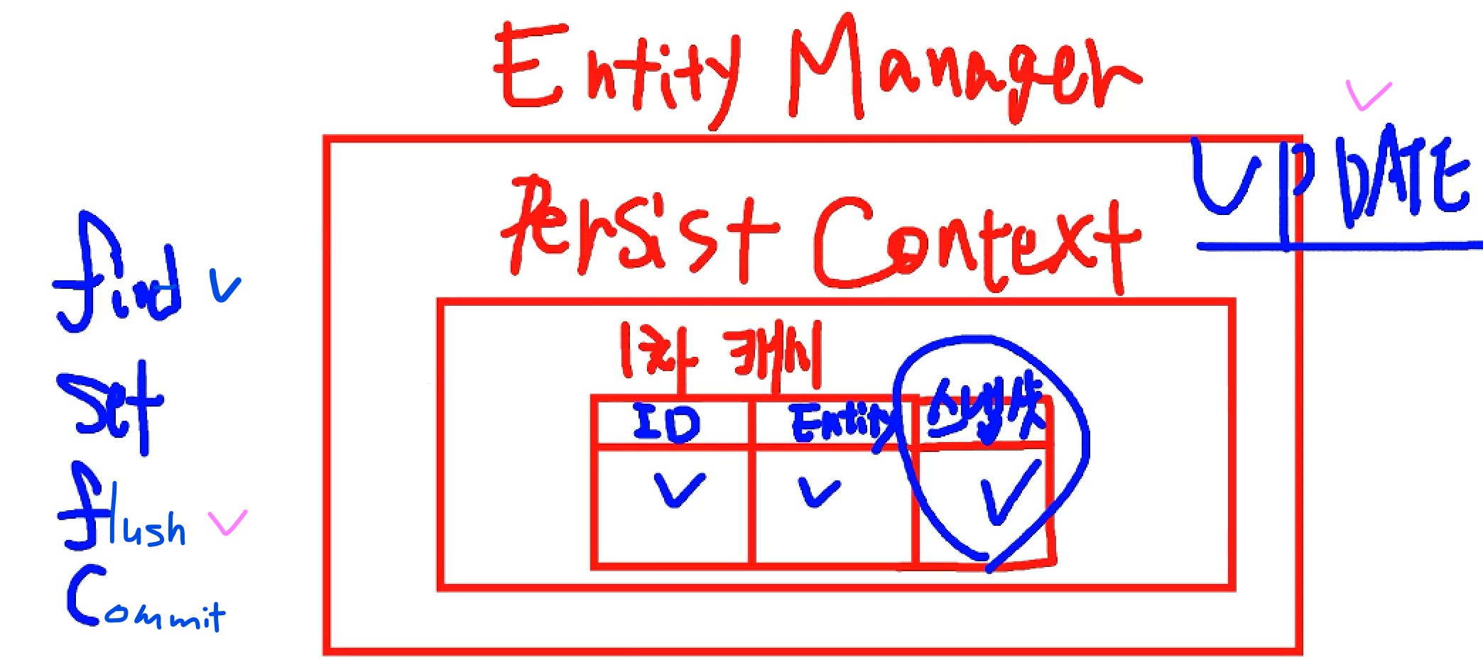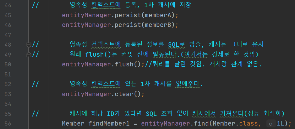 entityManager.flush(); //먼저 쿼리 내보내기//1차 캐시에 기억된 상태, 실무에서 사용할 수도 있음.
