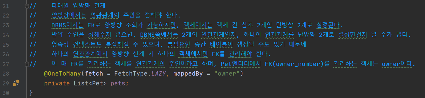 list<pet>에 fk가 있다는 뜻이니까 그 fk의 주인을 적어주는 것임.