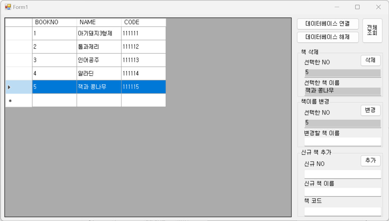 string sql = "SELECT * FROM BOOKS(NOLOCK)"; SqlDataAdapter adpt = new SqlDataAdapter(sql, conn); adpt.Fill(ds, "BOOKS"); //테이블명을 명시하지 않아도 된다. dataGridView1.DataSource = ds.Tables[0]; |