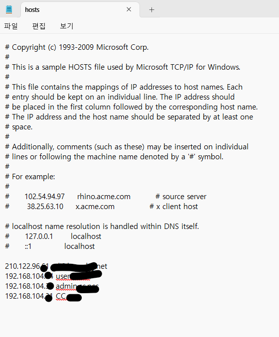 메모장을 관리자 모드로 열고, 파일을 수정해야 함.