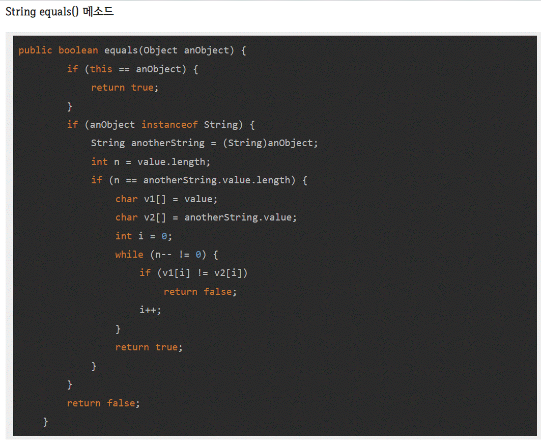 문자열클래스에서만 equals가 값비교로 재정의됨. 안에 있는 문자열을 비교.