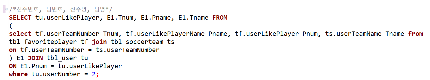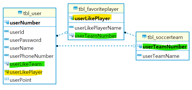 fk를 주지 않아서 각각 tbl_user / tbl_favoriteplayer / tbl_soccerteam 이렇게 3개의 테이블이 개별적으로 있었다..