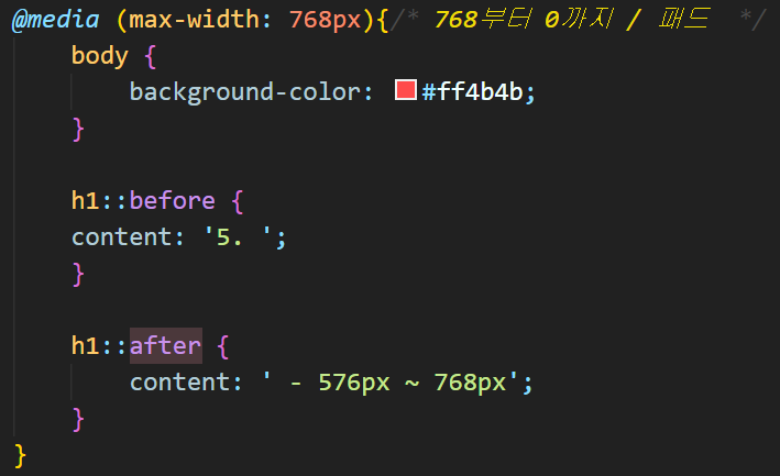 | @media | 미디어 쿼리가 시작됨을 표시 |