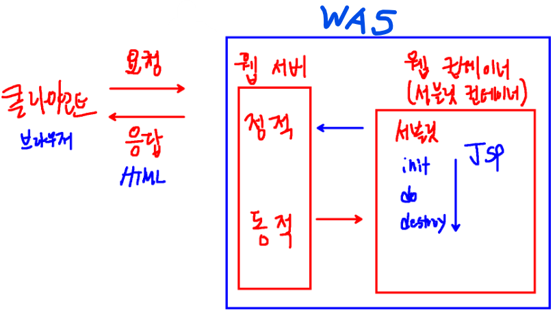 | 웹 서버에서는 정적 데이터만 응답가능. 동적 데이터를 처리하는 웹 컨테이너 -> 서블릿 컨테이너라고 부르기 동적 데이터 = 연산이 필요함. > 연산이 필요한 언어를 배워야 함. > 복잡한 연산 > JAVA를 통해서 하겠다. 서블릿(.java) = 자바로 만들어진 프로그램 동적인 데이터를 연산할 수 있는 자바 프로그램이 서블릿, 동적데이터 연산하겠다. 사용자가 요청이 얼마나 들어올지 모르고, 각각의 요청이 얼마나 들어올지 모른다. > 서블릿 컨테이너에서 서블릿이 여러개! 자바 웹서버는 멀티 쓰레드임. 요청 하나 당 하나의 쓰레드가 생김. 서블릿도 여러 개임. 요청하나 들어올 때마다 새로운 쓰레드 필요하니까. 요청이 들어와 봐야 아니까 서블릿은 대기 상태 대기 중이였다가 요청이 들어오는 순간 그 서블릿이 쓰레드를 통해서 메모리에 할당되는 것임. 쓰레드는 프로세스와 관련됨. 쓰레드가 서블릿 프로그램을 메모리에 할당을 해줘야 프로세스가 됨. 그래서 프로세스 당 하나의 서블릿을 잡고 메모리에 올려줌. 기존에 만들어 논 서블릿은 대기중임. => 분기처리. 서블릿 컨테이너는 WAS(web application server, 와스)가 깨워줌. 웹 서버에 동적 데이터가 감지되면 WAS가 서블릿 컨테이너를 깨워줌. ctrl+n 해서 .java파일 만들면, 그 파일이 서블릿이다. f11눌러서 실행되면 서블릿이 연산되는 것임. 자바파일에서 html을 쓸 수 있다 > 서블릿 http 추상클래스 상속받으면 서블릿이 된다. 자바 안에서 html을 쓸 수 있다. 응답할 때는 html언어로 응답해줘야 함. 통신할 때 html파일로 만들어주는 애가 서블릿 응답을 하기 위해서는 브라우저에 항상 html언어로 응답해줘야 하기 때문. java를 실행했을 때 콘솔이 아닌, .html파일로 출력 가능 서블릿의 단점을 극복하고자 나온 게 jsp > html 에서 java쓴다. jsp 파일이 컴파일 > 서블릿 파일 컴파일 > 결과페이지 html로 응답 jsp가 서블릿으로 변환되면서 html문서가 연산과 함께 진행이 됨. Q.서블릿으로도 개발되는데 왜 jsp 배우나요? 서블릿으로도 정적 연산 가능 > 웹 개발 가능, 하지만 서블릿으로 쓰게 되면 자바안에서 html 작성할 때 "" 오타에 대한 부분이 많이 불편해서, jsp인 html안에서 자바를 작성하는 게 개발에 있어서 훨씬 효율적이라 jsp를 사용한다. java언어가 있으면 무조건 서블릿이다. jsp도 서블릿이다. jsp도 컴파일이 된다.(연산하려면 필요함). jsp도 연산된다.(자바언어가 쓰이니까) <웹 컨테이너 안에 2가지 방식> 1.서블릿만 쓰는 것 2.jsp로 입히고 나서(.jsp) 내부적으로 서블릿(.jspservlet)으로 변환하는 것(정적 데이터) > html문서로 바뀜 > 웹서버로 전송 서블릿의 생명 주기(쓰레드의 연산 주기) : init, do, destroy |