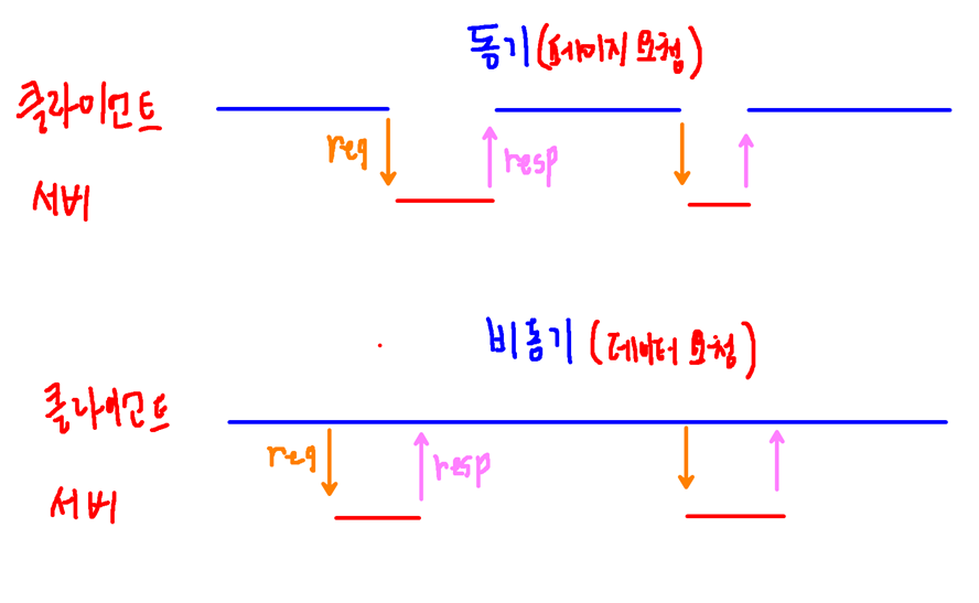 <-> 비동기 : 요청이 들어가던 말던 동시작업이 됨.
